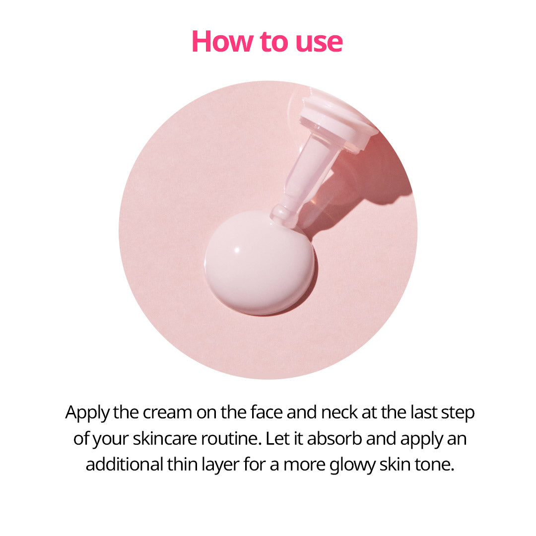 Apply cream on the face and neck as the last step of skincare routine. Let it absorb and apply a thin layer for a brighter, added tone-up effect.