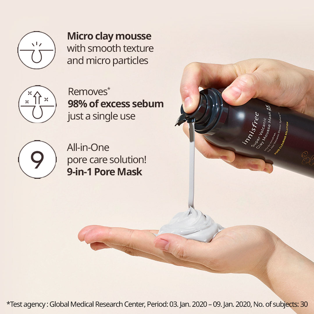 A mousse-type clay mask which contains Jeju Volcanic Clusters & Spheres™ to remove excess oil and cleanse pores